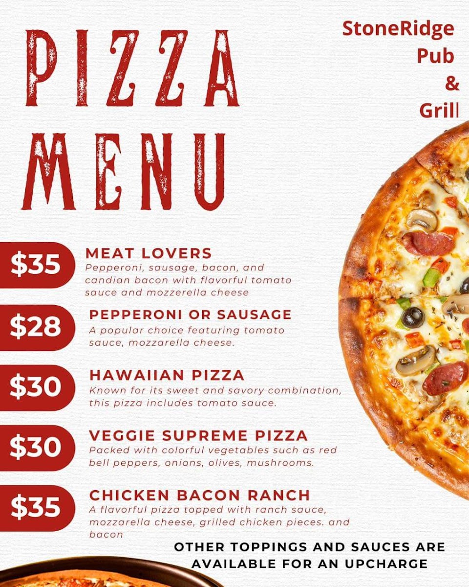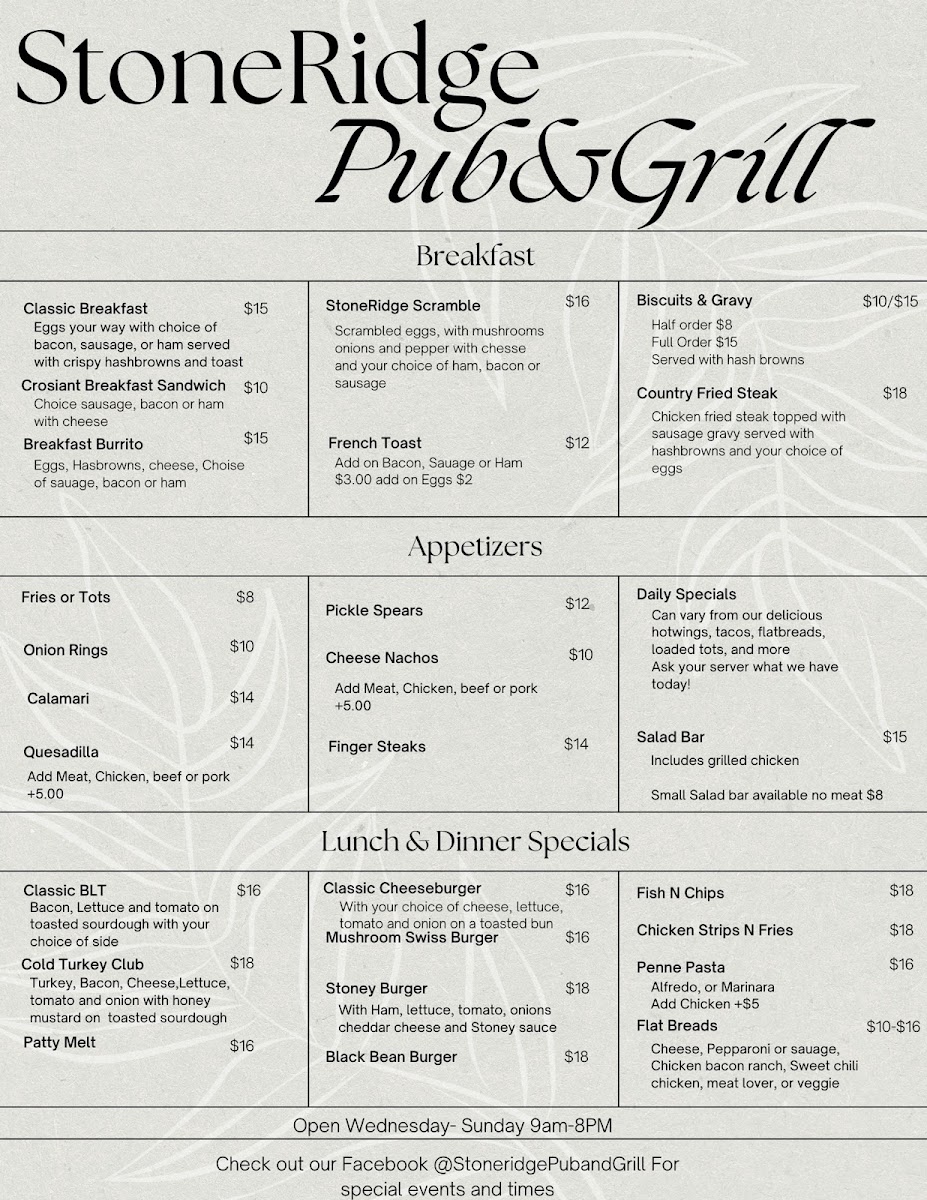 Overall, Stoneridge Pub & Grill’s menu successfully combines quality, variety, and value, ensuring that there’s something for everyone, whether you're here for a quick bite or a leisurely meal. The balance of classic pub fare and more sophisticated dishes makes it a standout dining destination in Blanchard.
