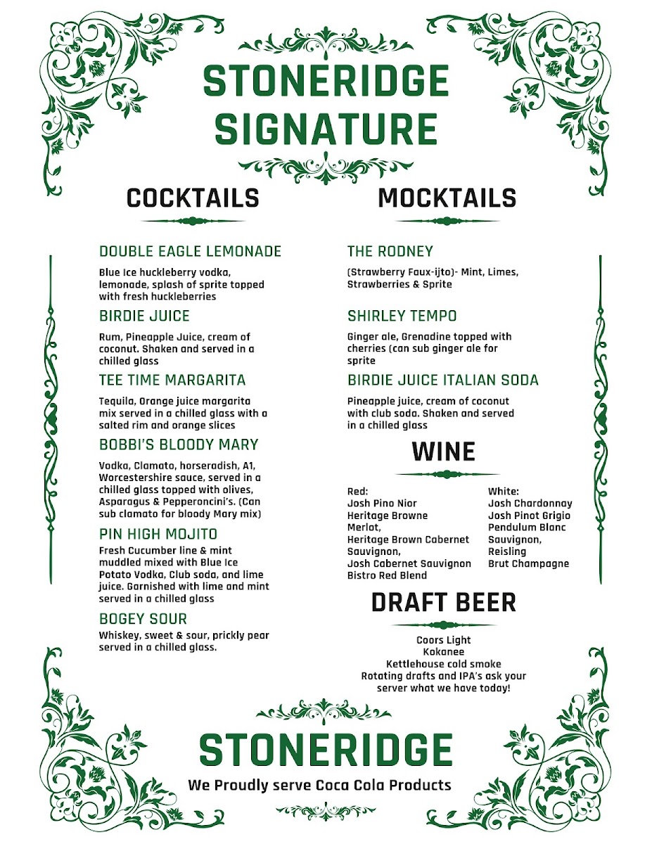 In addition to the food, Stoneridge Pub & Grill offers a welcoming atmosphere with a variety of drinks to complement your meal. Whether you're looking to unwind with a cold beer or enjoy a refreshing cocktail, the bar menu has something for everyone.